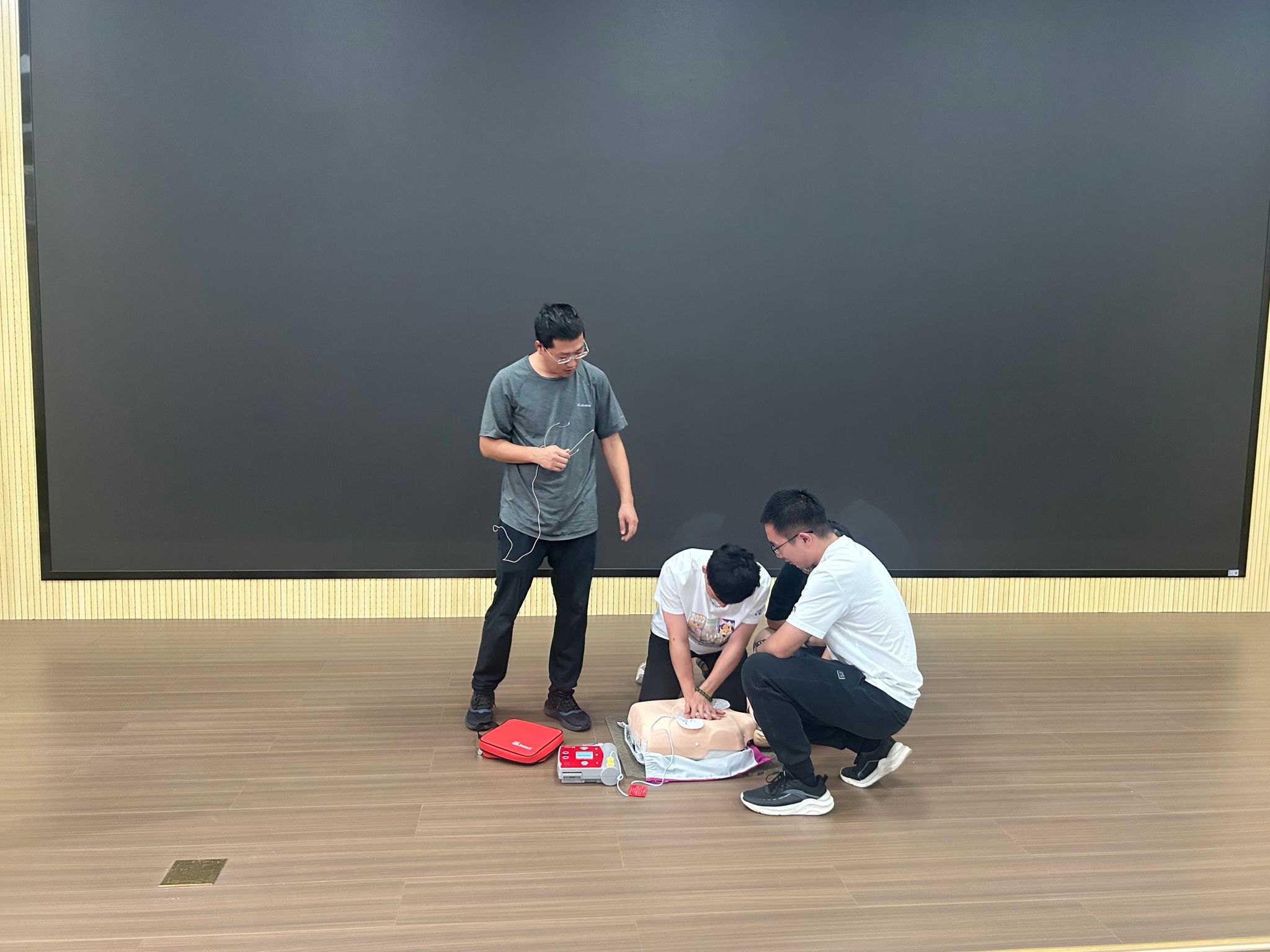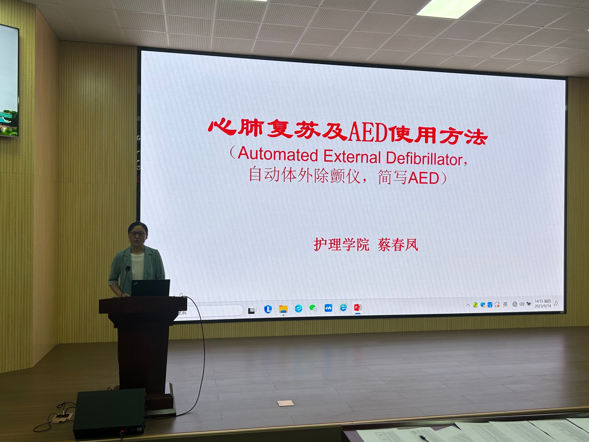 护理学院的蔡春凤老师做了“心肺复苏及AED使用方法”的专题报告,她详细介绍了心肺复苏的步骤和方法。张旭老师利用仿真人体模型,详细演示了现场常用急救方法和AED的科学使用流程,并邀请参训师生现场体验徒手心肺复苏等急救技能。
