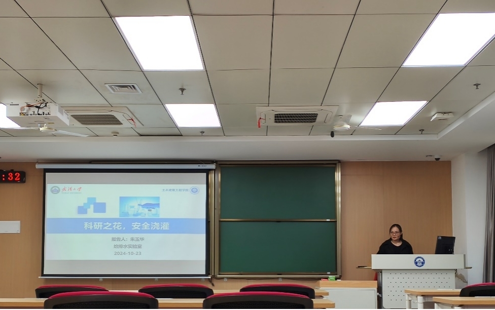 朱玉华老师以“科研之花,安全浇灌”为题就给排水实验室大型仪器设备管理、危险化学品管理、实验室安全管理、安全急救等方面展开介绍。朱老师凭借其化学专业知识和丰富的实践经验,生动形象地为大家进行了详细的讲解,并通过问答环节让同学们更加意识到实验室安全的重要性及注意事项,现场气氛热烈。