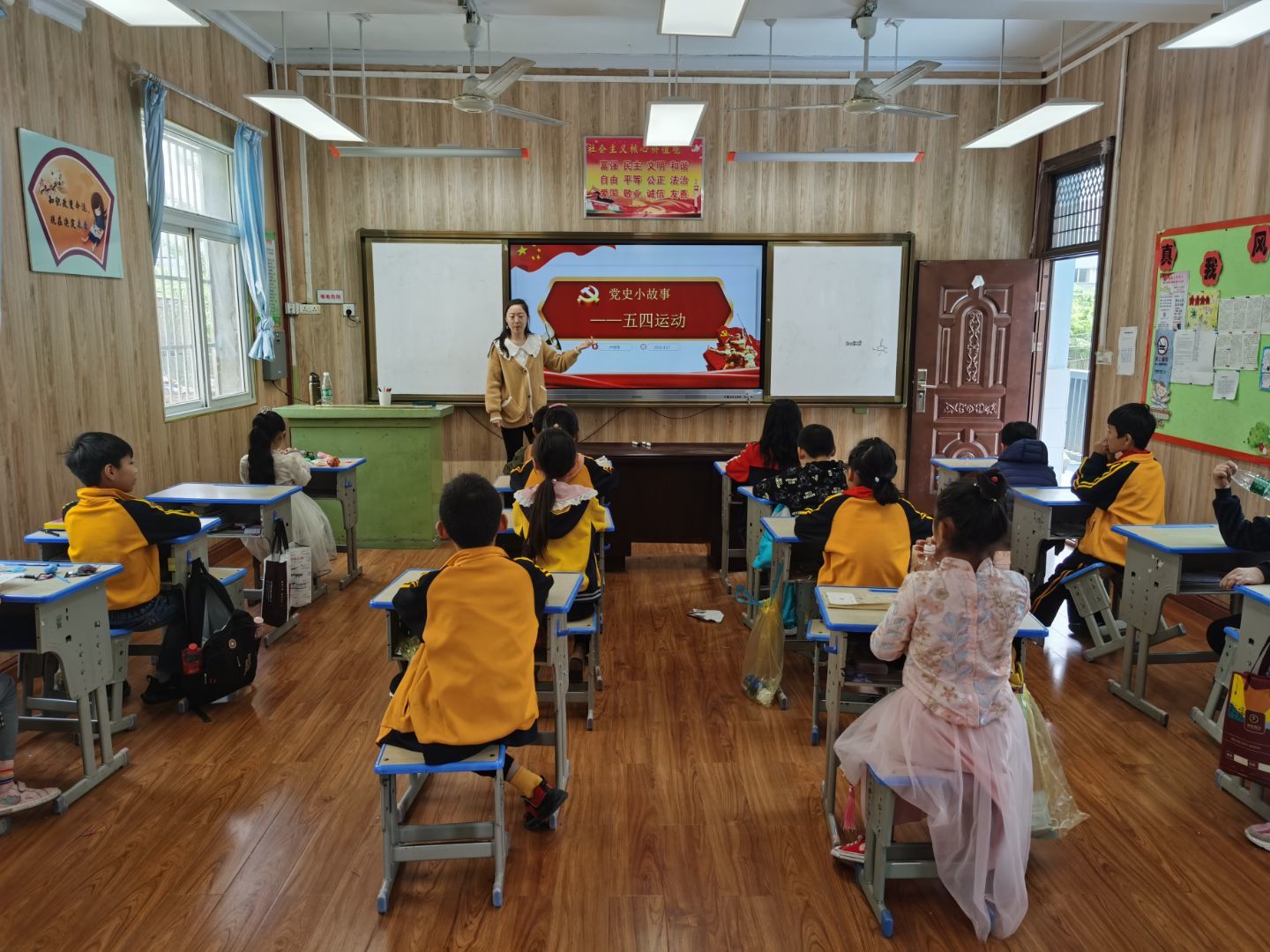 本次实践活动中志愿者们专门准备了“学党史”思想教育宣讲,雷青、卢佳佳、罗芷瑶三位本科生党员代表分别以“红船”精神、五四运动及党史发展过程中的突出人物为主题展开介绍学习,着眼历史重要节点展望时代精神内核,以典型人物事迹映射艰辛建党历程,为孩子们构建“党的发展历史进程”认知思维体系雏形。