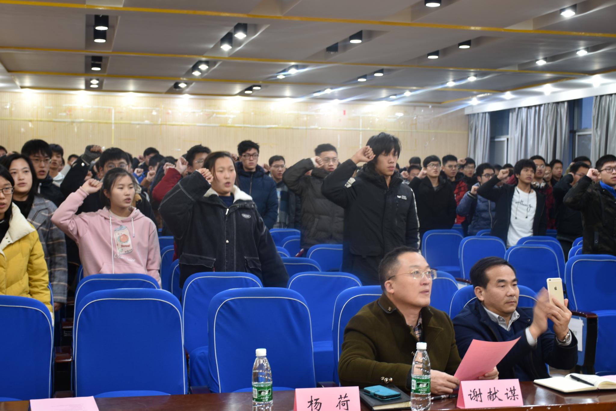 “我宣誓:争做一名宿舍优良环境的建设者、文明行为的践行者、宿舍文化的传播者!从我做起,从现在做起。讲究卫生、美化环境,按时作息、文明用网,团结室友、互助友爱,规范言行、维护秩序……”12月20日下午,学院学生宿舍文化建设工作推进会暨“宿舍文化节”表彰会于力学楼报告厅隆重举行。全体本科生寝室长郑重宣誓,积极参与到学院宿舍文化建设中,为创建文明和谐的宿舍环境贡献力量!党委学工部副部长仲华、后勤集团副总经理刘扬、后勤集团宿教中心主任黄德明、学院党委副书记谢献谋、学院学工办老师等出席大会。
